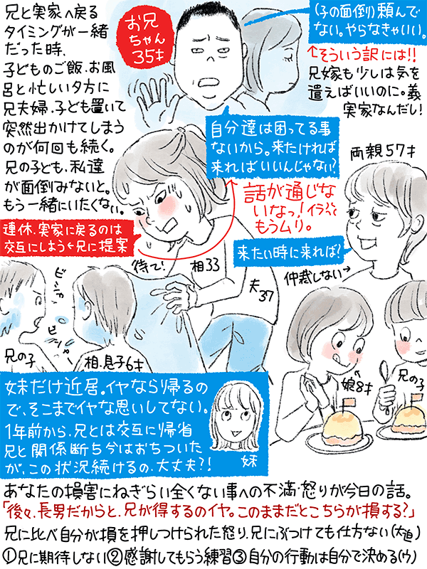 話が通じないな!親にももう無理、私の前で兄の話をするな、兄とは帰省交互と決め1年。今は落ち着いてるが、この状況続いたら親の相続とか大丈夫か心配という33歳女性のご相談。
