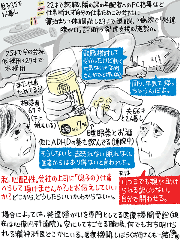 22歳で就職したが、仕事を溜め会社に寝泊まりするようになり23歳で退職、発達障害と診断され発達支援の施設へ。25歳で再就職したが、また仕事を抱えてきている?