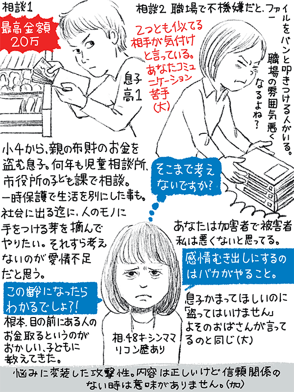 小四の頃から親の財布からお金を盗む息子。児相や役所の子ども課に相談、一時預かりで生活を別にしたりしたが、なくならない。それとは別に、会社で不機嫌を露わにする人がいる、職場の雰囲気悪くなるのがわからないのかな?という48歳シングルマザーのご相談。