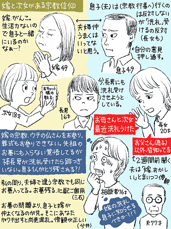 息子の嫁が数年前からある宗教信仰(次女も)。息子は信仰行事に行くこと自体反対はしてないが洗礼には反対していた。が、2週間前、嫁と次女が洗礼したと長女(父と同意見)から聞く。息子以外はみな知ってるようだが、このことを息子に知らせるべきか知らせないべきか?という76歳女性のご相談。