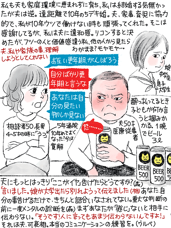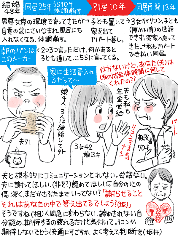 夫と根本的にコミュニケーション取れない。体調崩して別居したが、3女が障がいのある娘を連れ実家に戻ってきたのを機に同居再開。二言三言程度で、何かあれば子どもを通し言ってくる。