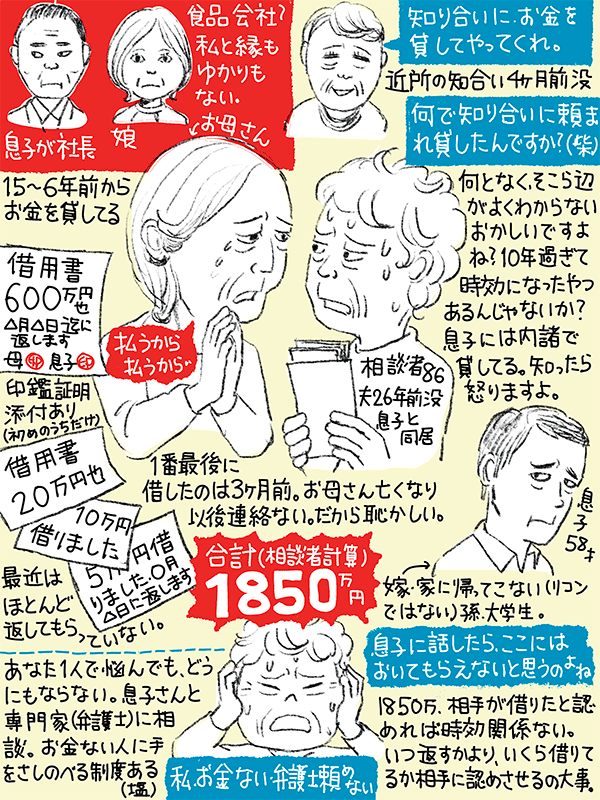 息子には内緒で貸しており、知られたら怒られる。私もそんなになるとは思ってなかった。どこへ(相談しに)行ったらいいかわからないという86歳女性のご相談。