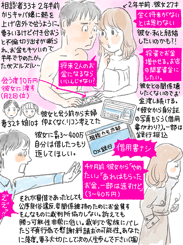 二年半前からキャバ嬢に入れあげ店外で会うようになった(一回10万総額3〜400万円)。自分としては途中から彼女にお金を貸したつもりだったが、4ヶ月前に彼女から関係をやめようと言われ「あのお金はもらったお金、一部(3〜40万)しか返せない」。返してほしいが裁判所でこじれて家族にバレたくないという33歳男性のご相談。