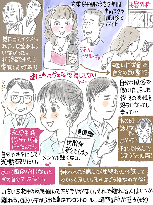 学生時代、風俗でバイトしたお金で美容整形。整形に関しては偏見なくなってきており後悔してないが「(整形の)お金どうしたの?」と言う話になると人を選ぶけど話したい。が周りの対応変わってしまうのも怖いという24歳女性のご相談。