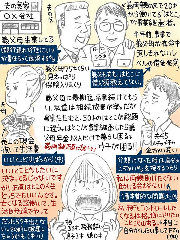 夫の実家が事業をしてる。50歳のはとこが事業継承者。義父が「借り入れをある程度きれいにしてから継承したい」と言っているが、義両親だけでは返しきれない借入があることが判明した。はとこはその額を知らされていない。