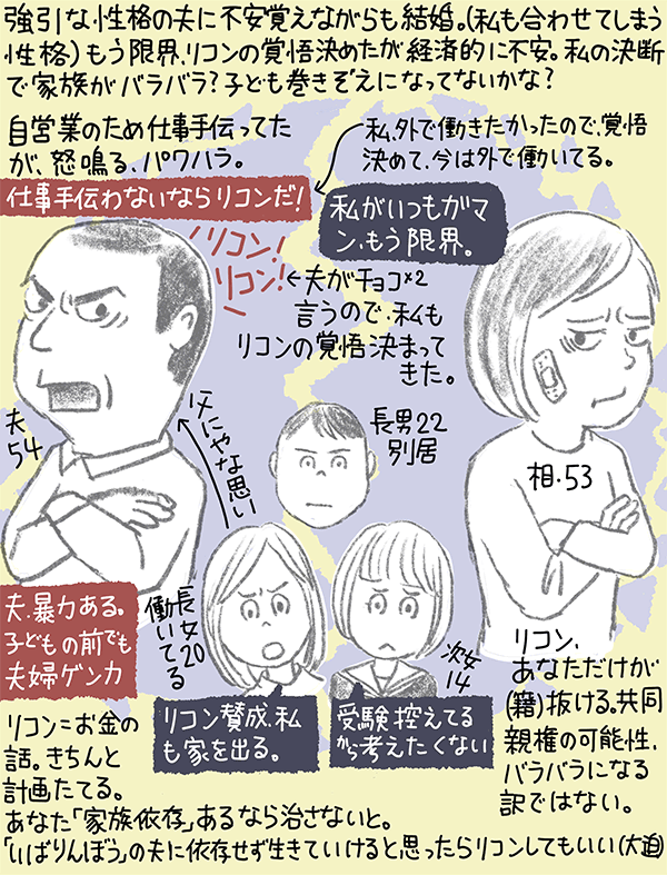 強引でパワハラ、暴力ある夫と離婚の覚悟を決めたが、経済的な基盤が私にできていない。私の決断で家族がバラバラになってしまう?子どもを巻き添えにしてる?と不安がいっぱいで前へ進めないという53歳女性のご相談。