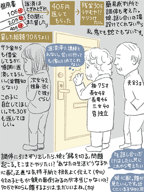 42歳の近居の娘(独身)に70万円貸したが、残高30万円ある。返済も途切れ途切れ。歳も歳だしこのままうやむやにされてしまう?サラ金からも借りてるようだが、こちらは順調に返済してる様子。