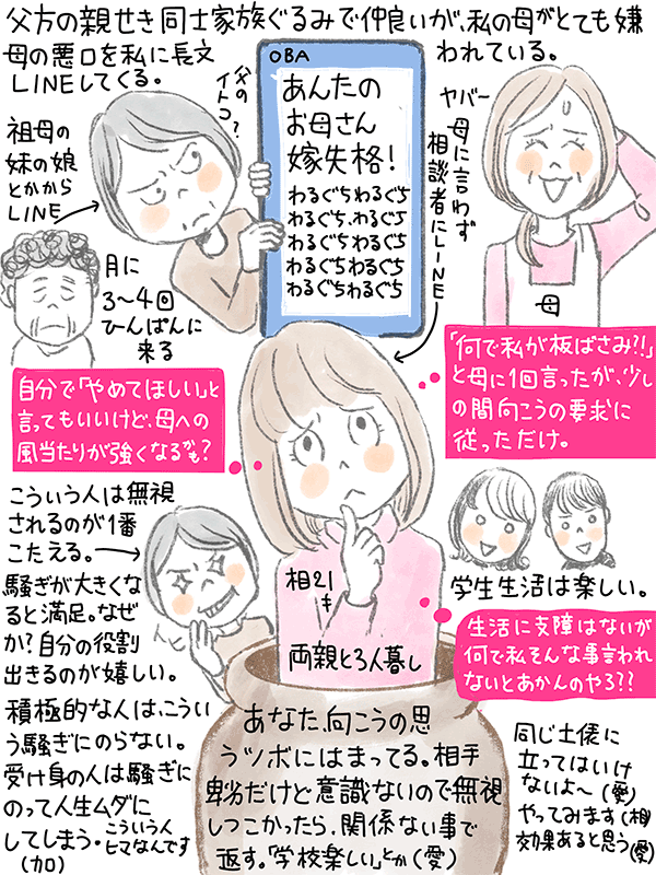 父方の親戚と母がずっと仲悪い。母が嫌われており、私に母の悪口の長文LINEを月に3,4回送ってくる。