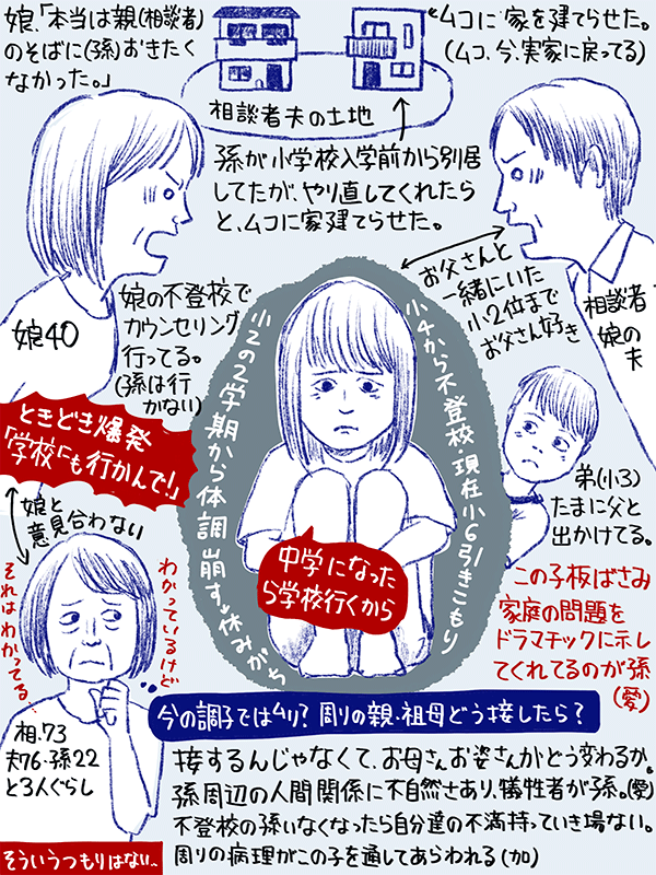 不登校の孫のことで、孫本人は行きたがらないので、母親だけでカウンセリングに行くが