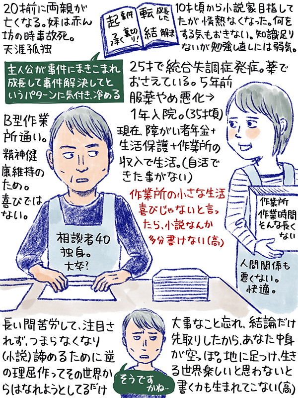 両親は20歳前に亡くなり天涯孤独、仕事もうまくいかず25歳で統合失調症を発症、今はB型作業所に毎日通い障害者年金と生活保護で生活している。
