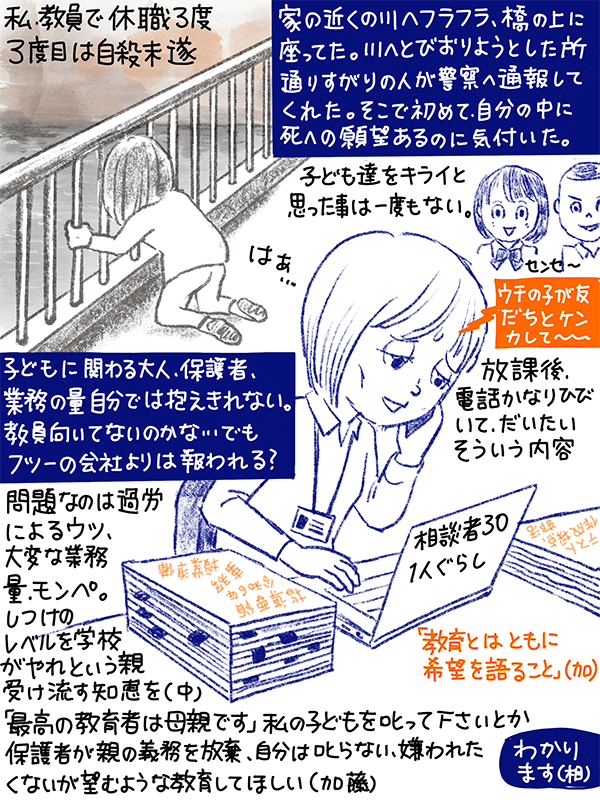 教員の友人も教師は心身病んで休職多いと言ってた。穴を埋める教員も見つからず職場に残ってる先生達で、「〇〇先生が戻ってくるまで頑張りましょう」と励ましあったと聞いた。泣ける。