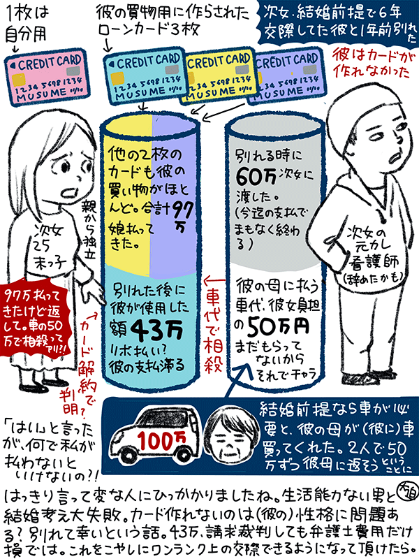 1年前に別れたが、そのあとも元彼は次女名義のカードを使用し、支払いが滞った額が43万。