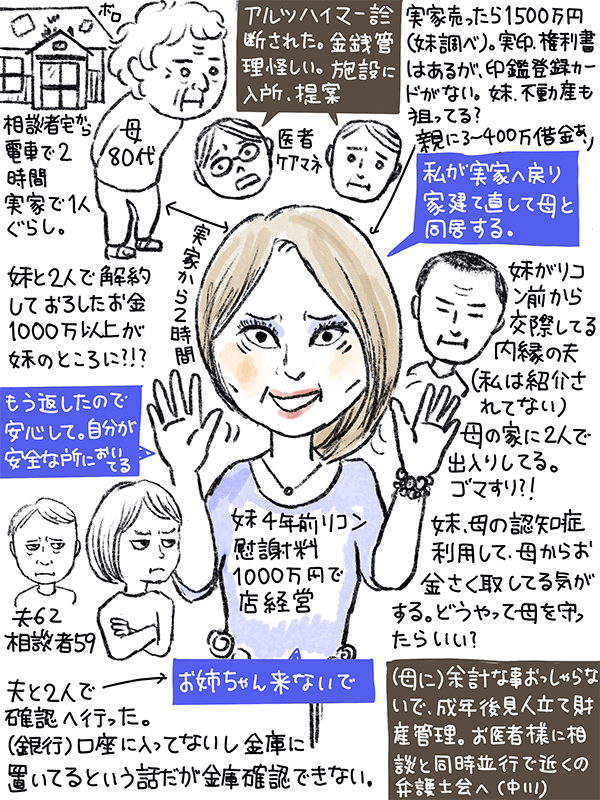 母の認知症を利用して母からお金を搾取しようとしてる妹から、母を守るには?という59歳女性のご相談。