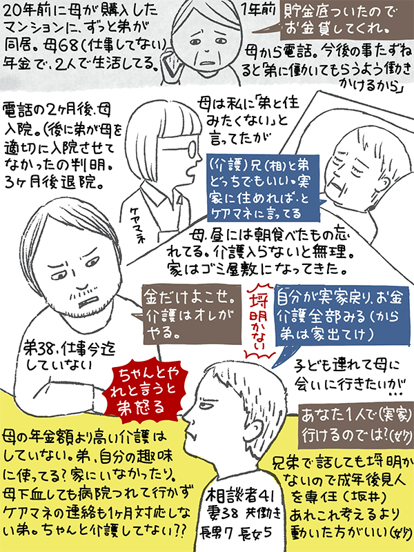 「(弟が)家にいなかったり」って、相談者家族が同居&介護離職しても家人不在の時間は出来てしまうと思うのだけど。子ども小さいし。