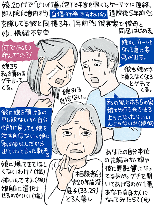 情緒不安定で心療内科に入院歴のある娘。3年前から彼と同居しているが(未入籍)、私を責めるようなキツイ言葉を言ってくる。