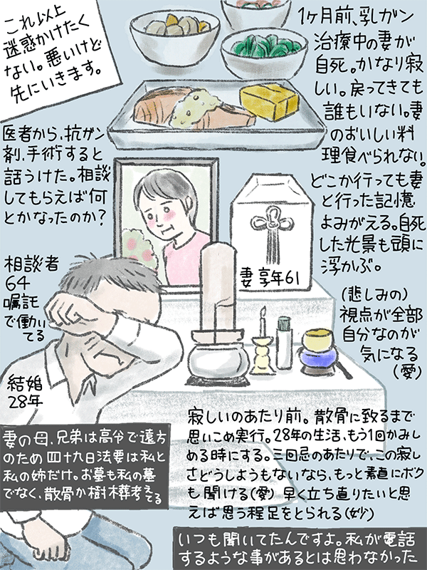 乳がん闘病中の妻が1ヶ月前に自死、非常に寂しい状態。
