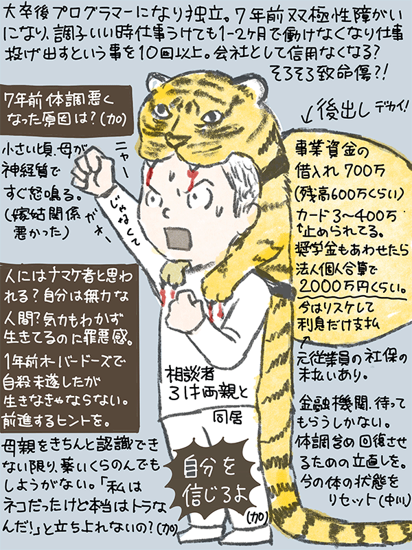 7年くらい前から双極性障がいに。1〜2ヶ月仕事受けては働けなるというのを10回以上繰り返しており、借入金が膨れ上がってきた。取引先の信用もそろそろ致命傷?