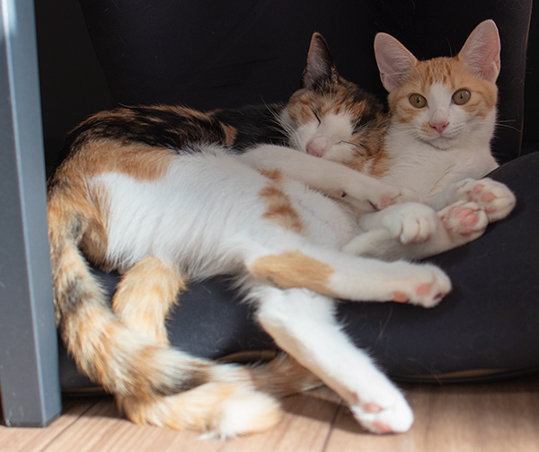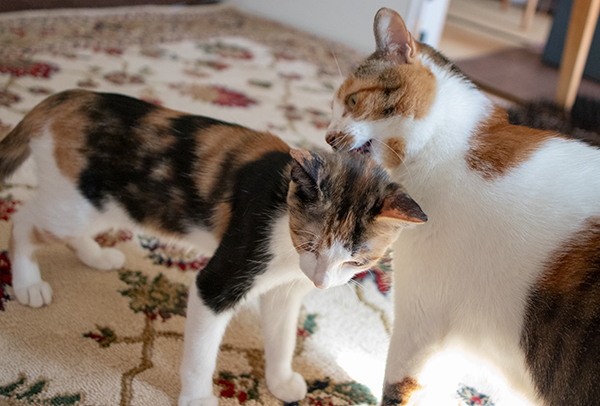 三毛猫の方は先住猫ミケーネたんの懐に入った模様。