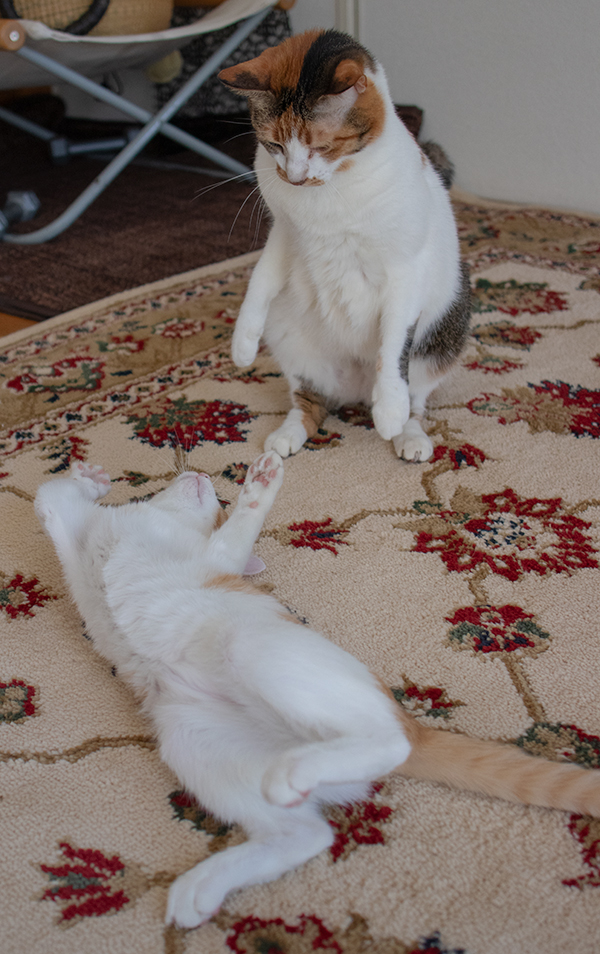 連日激しく遊ぶ子猫ズ、三毛猫の方は動きが激しくて写真が撮れないという…。