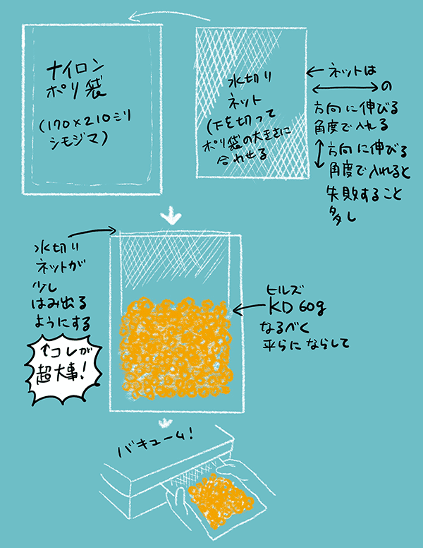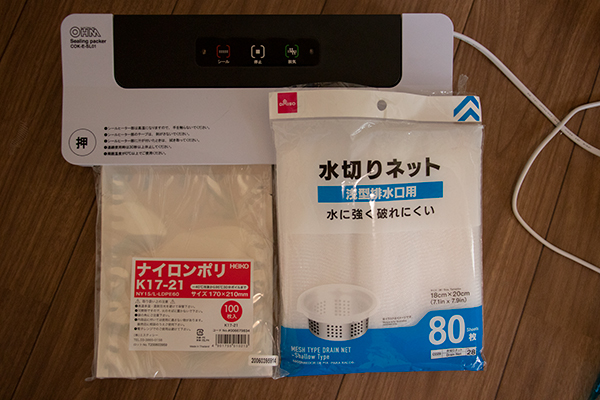 シモジマのナイロンポリ袋(100枚770円)+100均の水切りネット(浅型)